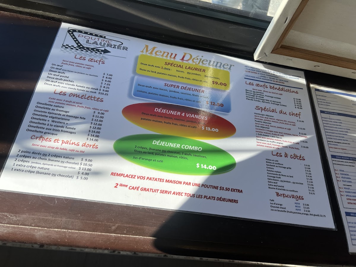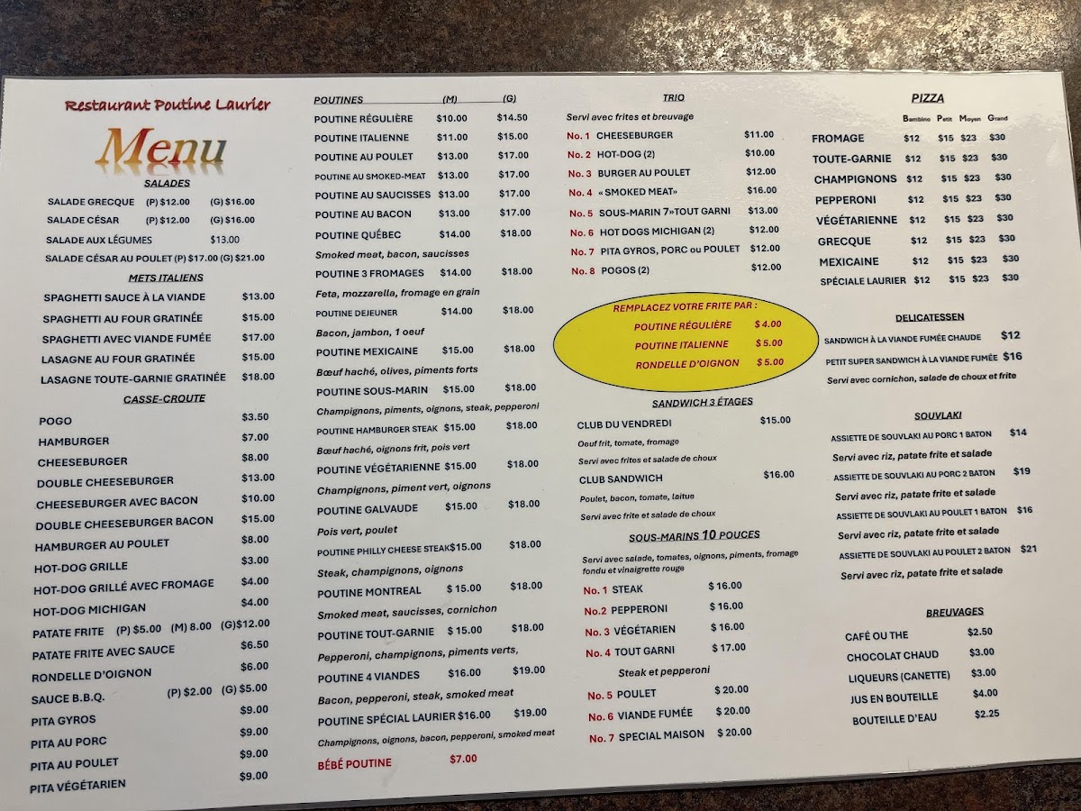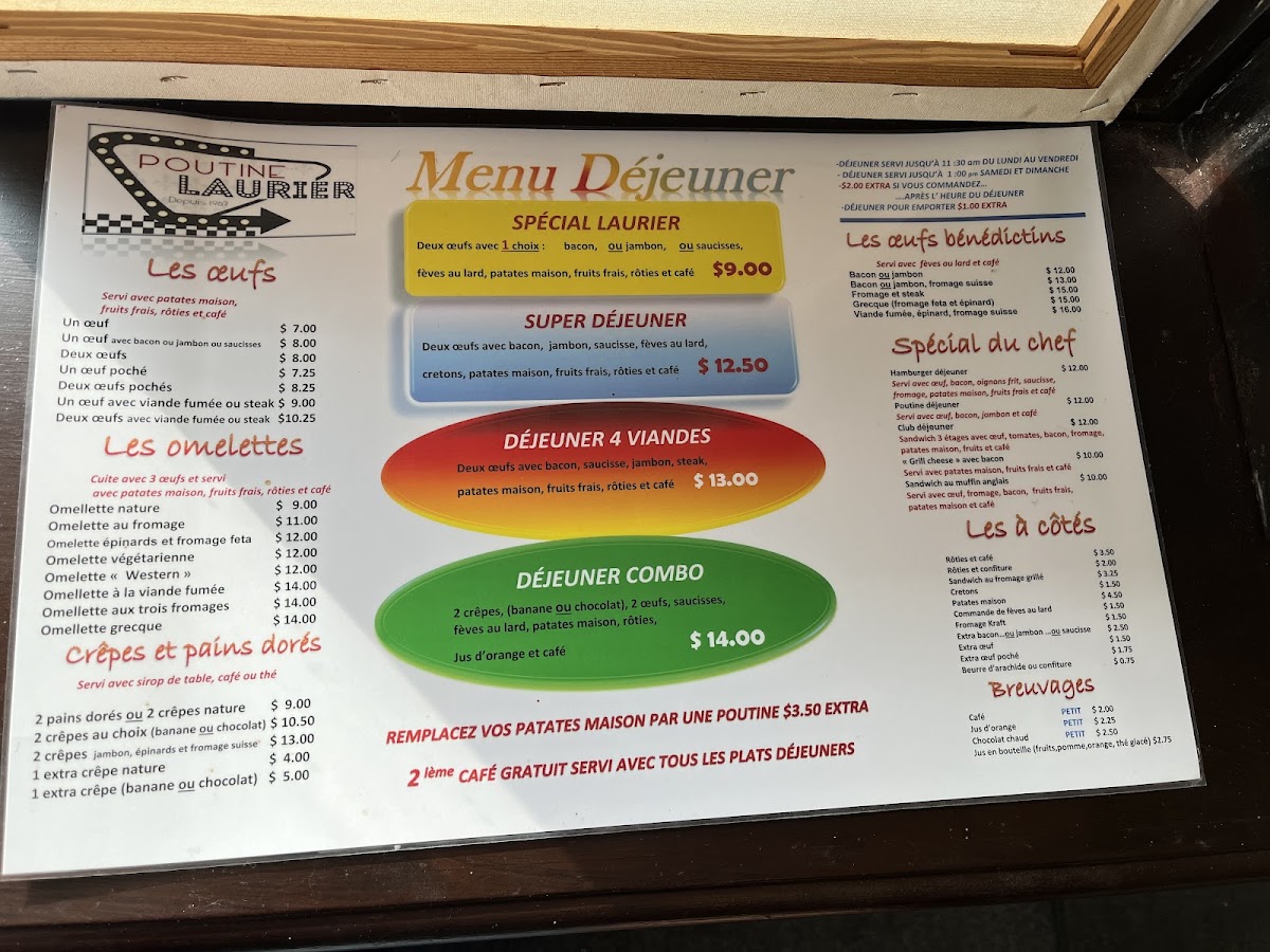 The menu at Poutine Laurier Restaurant offers a straightforward selection of comforting, casual dishes that fit perfectly into any time of day. From breakfast options like the crepe with ham, spinach, and Swiss cheese to heartier fast food staples such as burgers and their signature poutines, the menu balances familiar flavors with generous portions.